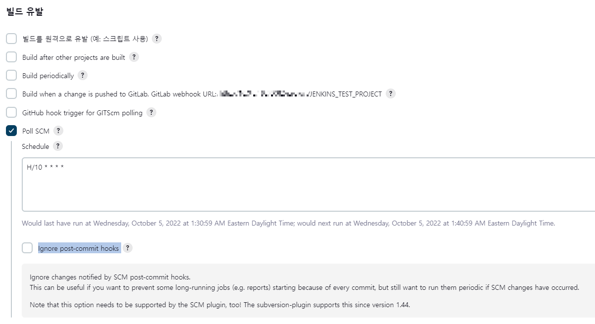 Schedule에서 원하는 시간 스케쥴링을 입력하고 Ignore post-commit hooks 여부를 결정합니다
