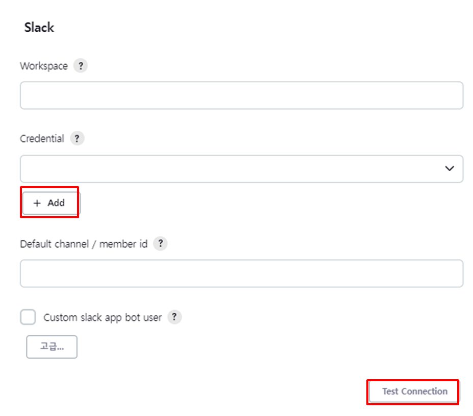 Credential에서 생성한 값으로 변경한 후, Test를 눌러 슬랙알림이 온다면 성공한 것입니다.