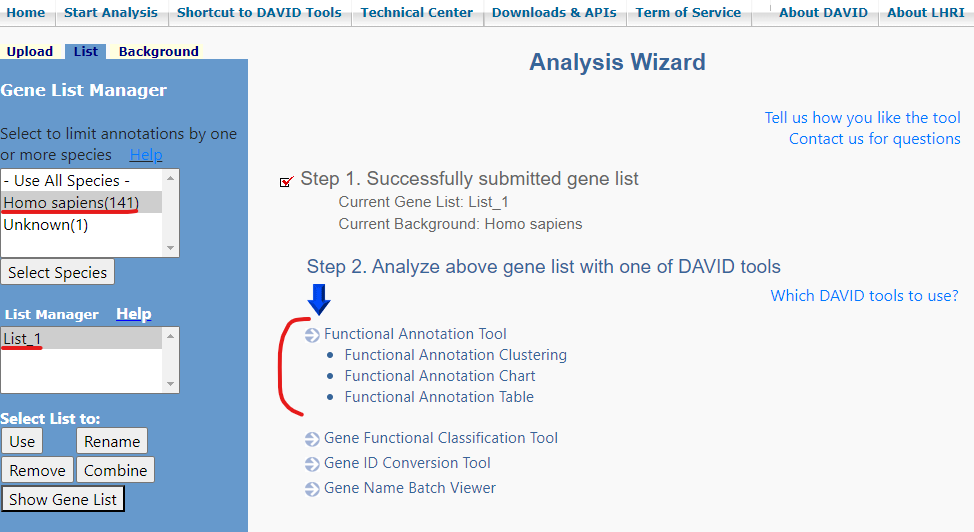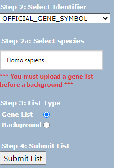 그 후, step 3.에서 Gene List를 선택하여 Submit List를 누른다.